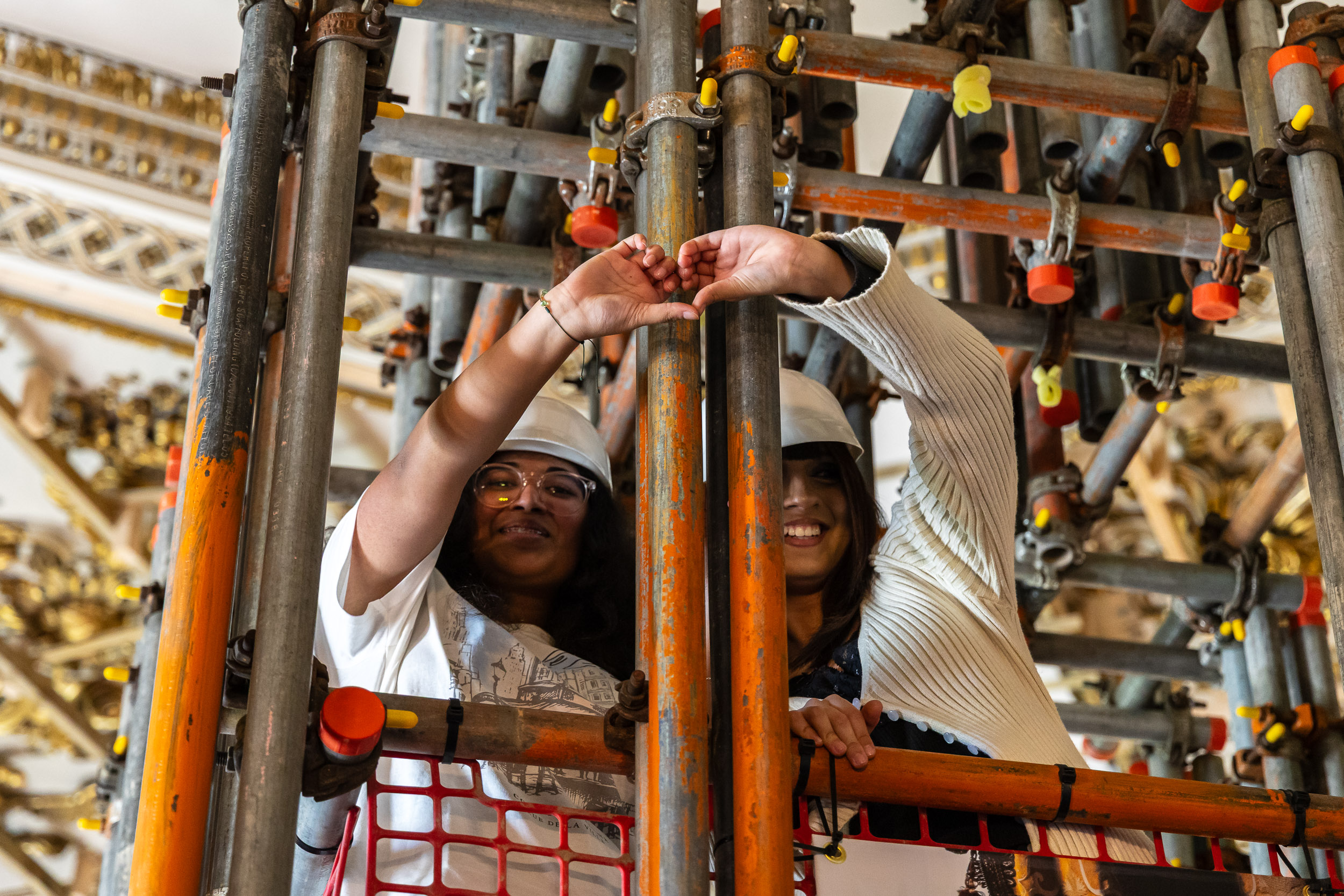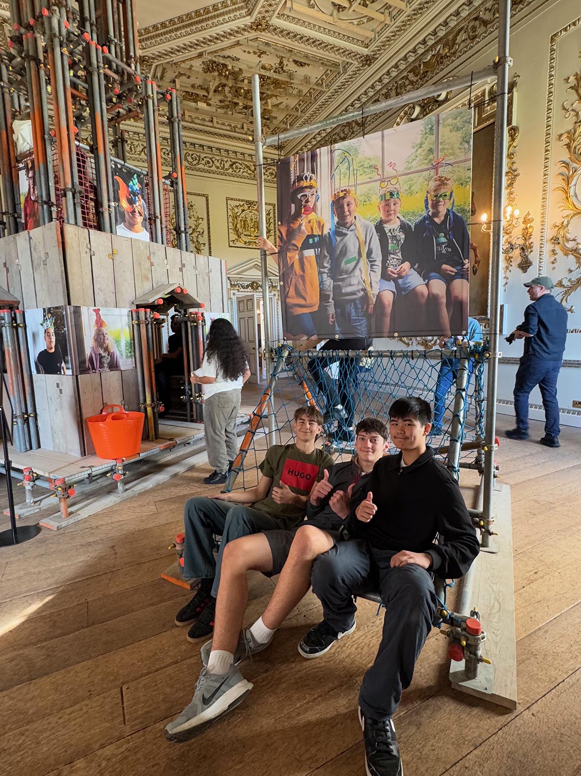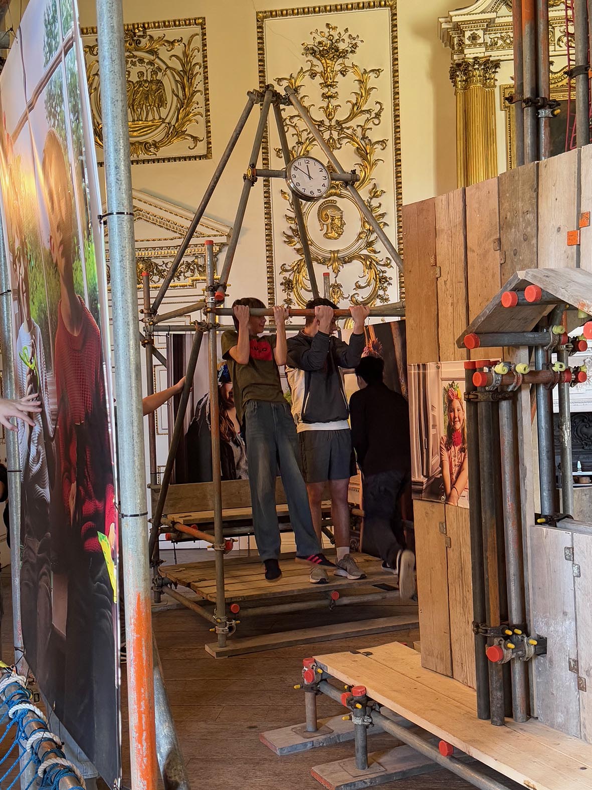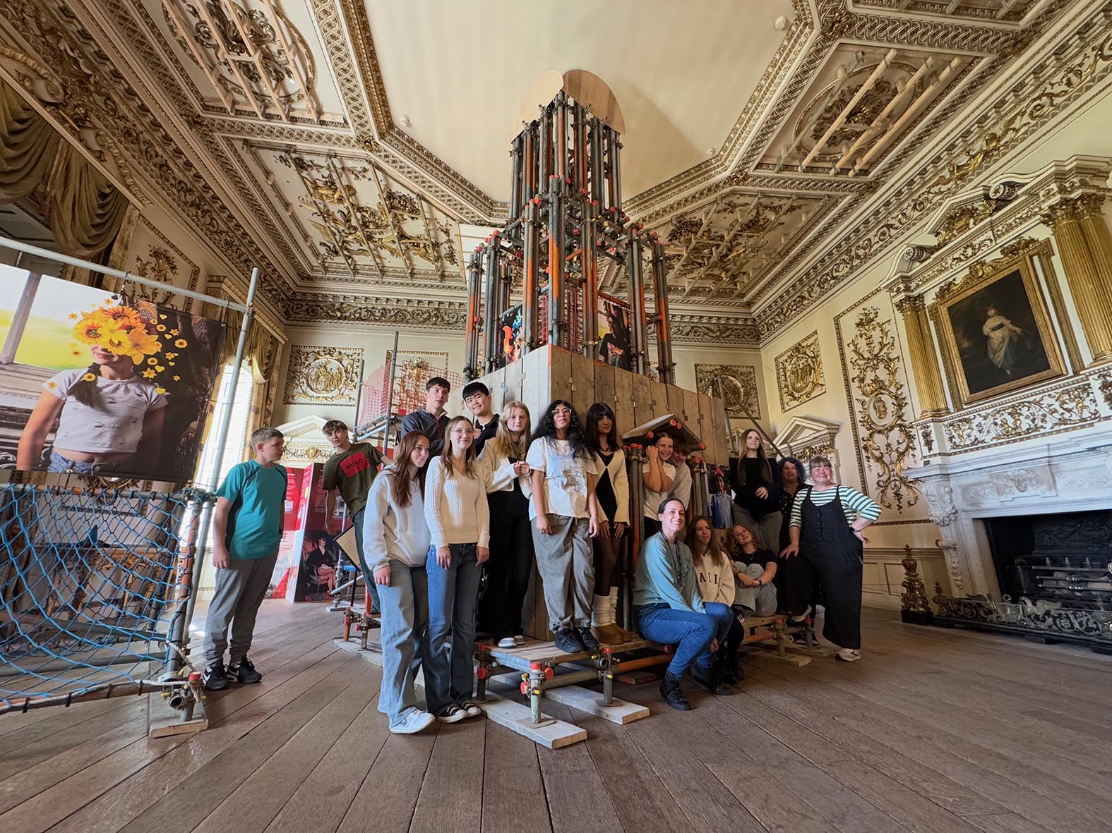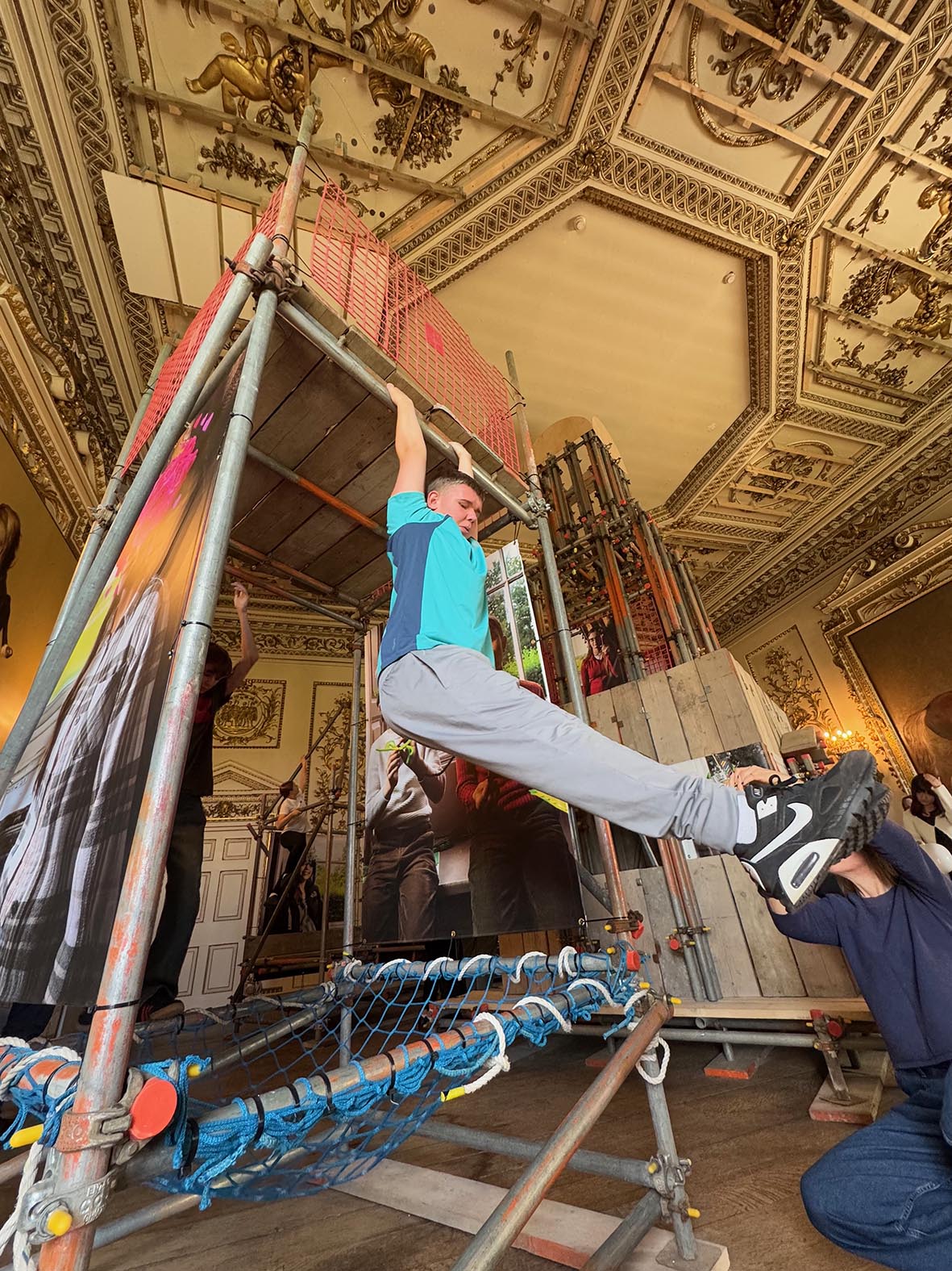 Scaffolding as a medium symbolises change and transformation, not just in the physical sense but also in an economic one as the house transitioned from the private ownership of the landed aristocracy to a trust that welcomes people from all classes and backgrounds in 2017. Once the playground of the rich and famous, the state rooms now become the playground of local young people who can see themselves and their friends represented alongside former Marquesses and Earls.
